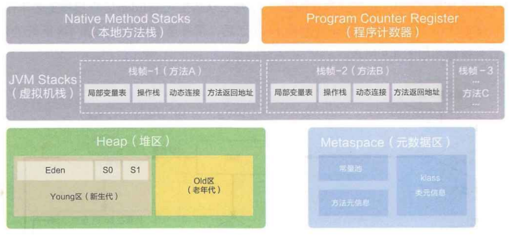 PC Register):这只是一个很小的内存空间,保存着下一条执行的指令的地址。native 方法,则这个值是未定义的。JVM Stack):存放了方法调用的关系。JVM 栈中每一个元素,称为栈帧(Stack Frame),每个方法在调用时都会创建一个新的栈帧。比如:局部变量,当方法运行结束后,栈帧就被销毁了,即栈帧中保存的数据也被销毁了。JVM 会抛出如 StackOverflowError 和 OutOfMemoryError,都和该区域有关。3. 本地方法栈(Native Method Stack):用于支持 Native 方法的调用。