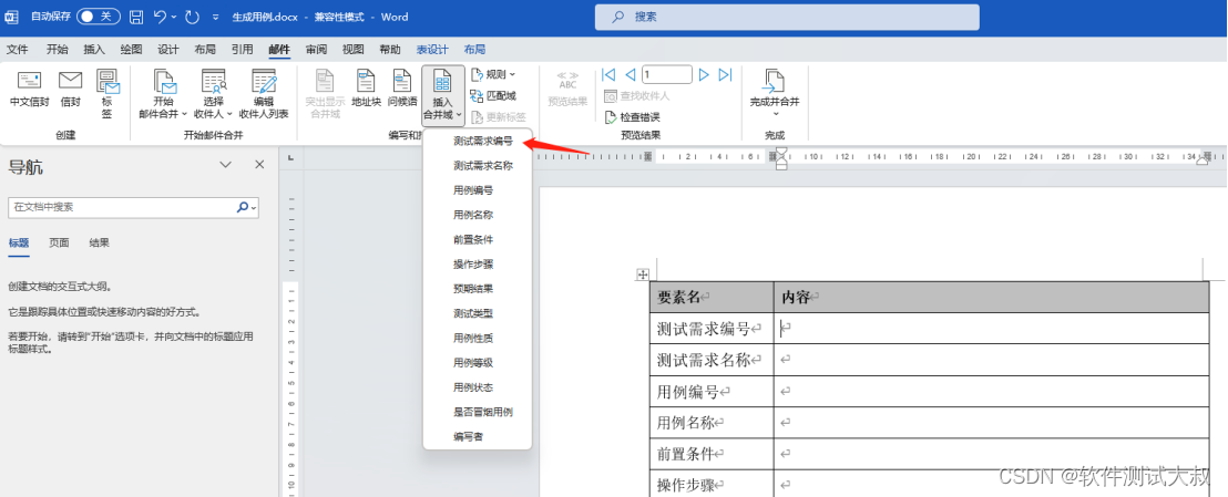 步骤7,点击“插入合并域”,点击匹配的测试用例excel字段;