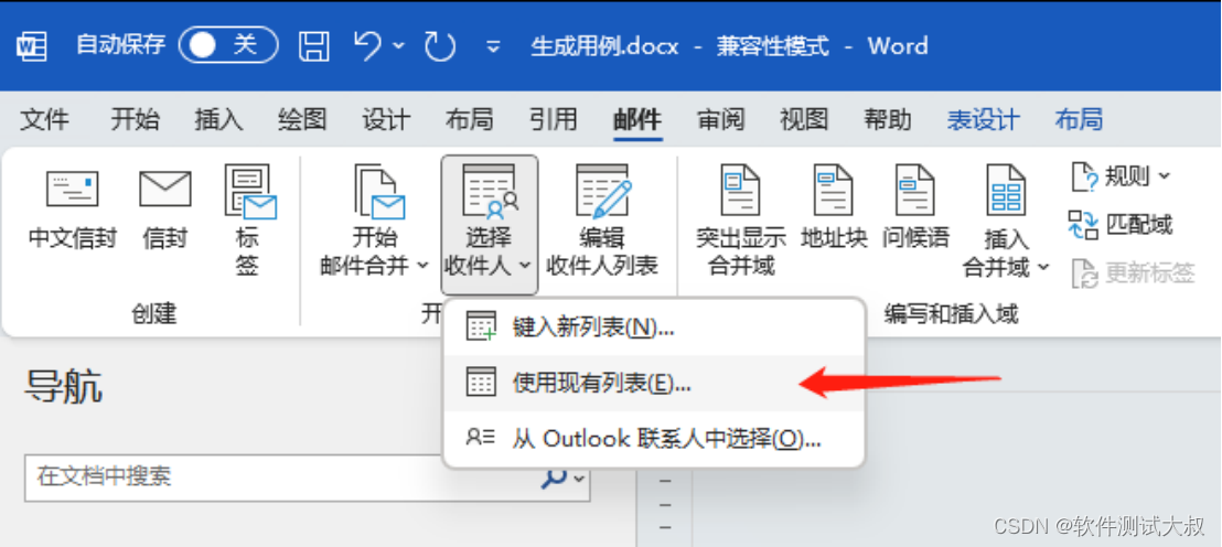 步骤4,在邮件页面,点击“选择收件人>使用现有列表”,选择测试用例excel文件,点击“打开”按钮;