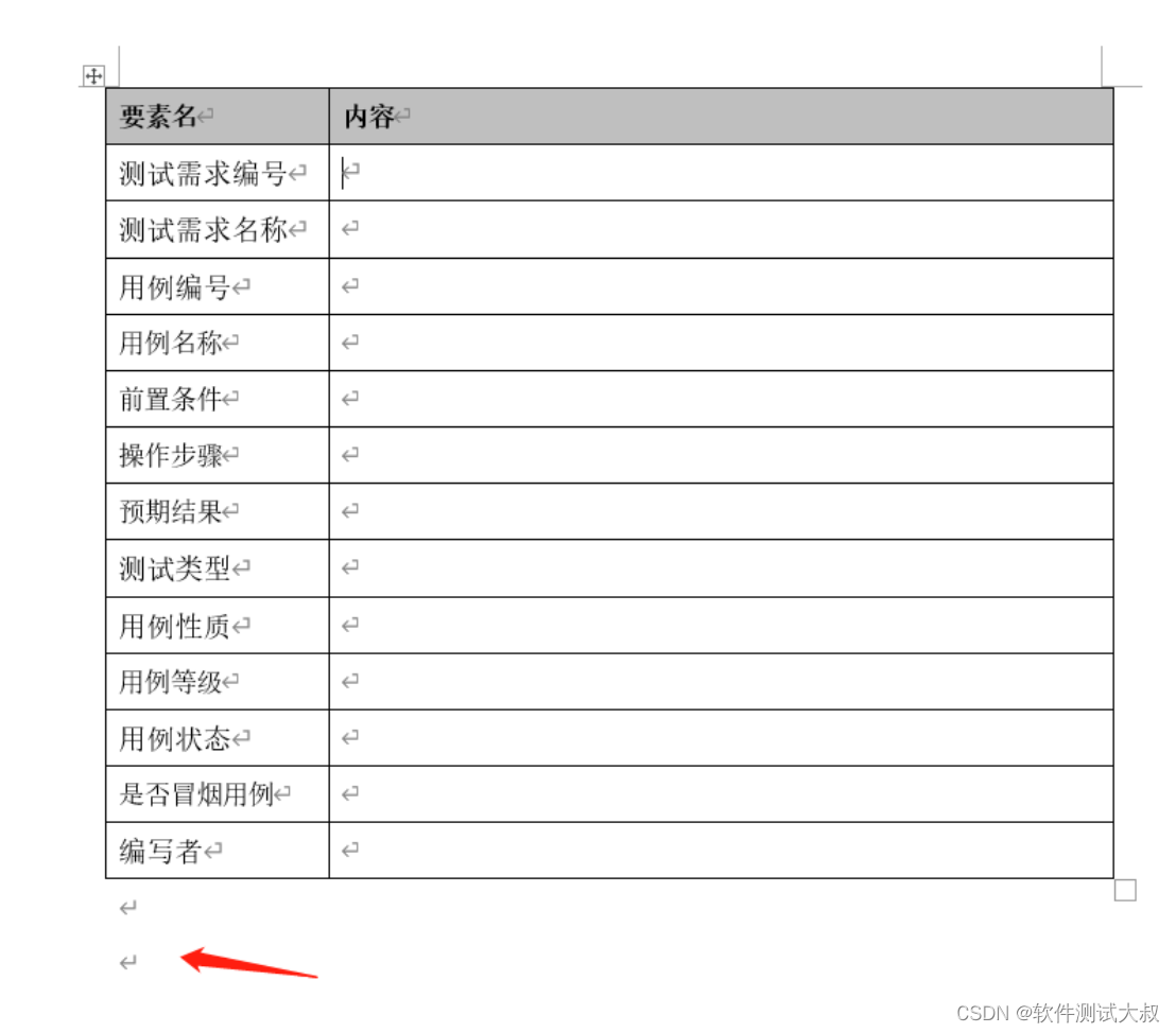 步骤1,按Word文档要求,创建一个空的表格,参考下图(这里建议在表格后加两个回车换行,否则最后批量生成的表格会变成连体表格)