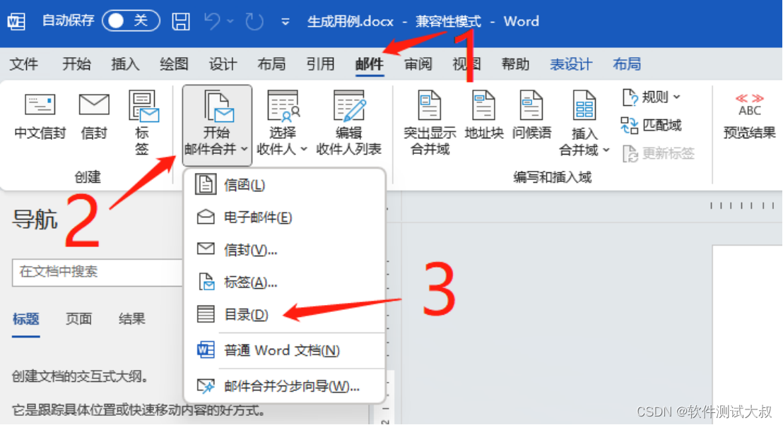 步骤3,在Word中,点击“邮件>开始邮件合并>目录”;