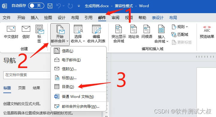 步骤3,在Word中,点击“邮件>开始邮件合并>目录”;