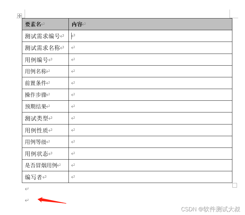 步骤1,按Word文档要求,创建一个空的表格,参考下图(这里建议在表格后加两个回车换行,否则最后批量生成的表格会变成连体表格)