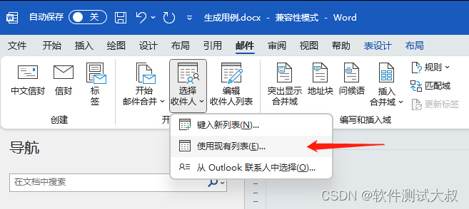 步骤4,在邮件页面,点击“选择收件人>使用现有列表”,选择测试用例excel文件,点击“打开”按钮;