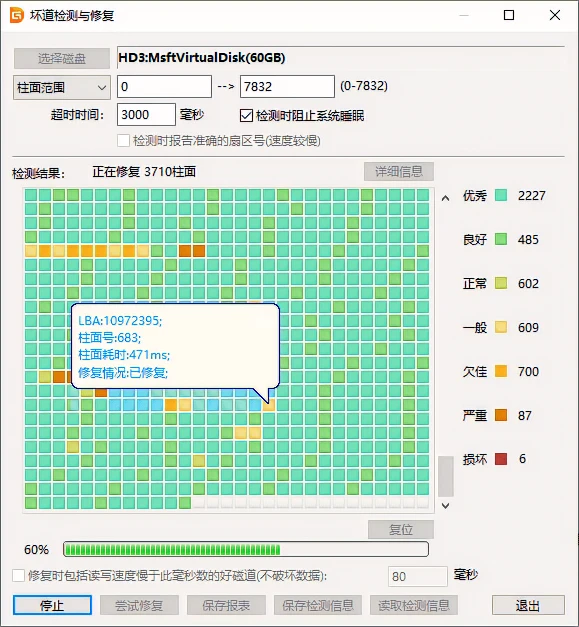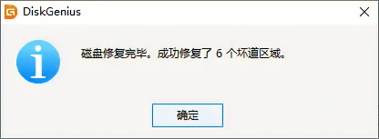 如果要立即尝试修复刚刚检测到的坏道,可点击“尝试修复”按钮。软件显示下面的提示: