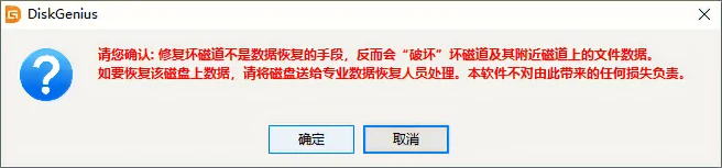 如果坏道区域存有重要数据,请不要用本功能修复坏道,而应该将硬盘送到专业的数据恢复中心恢复数据。坏道修复会破坏数据,而不是恢复数据!另外需要说明的是,并不是所有的坏道都能修复,本功能可以修复的坏道种类有限。