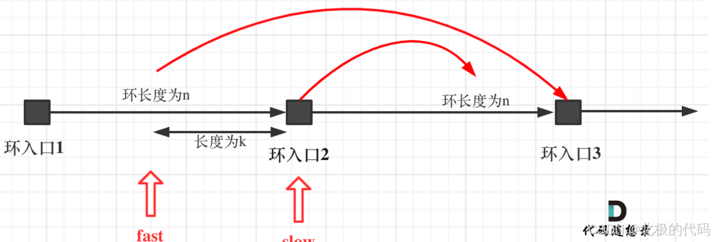 这里我们也可以使用从特殊到一般的办法,递归寻找,对n进行赋值,也能发现这一规律。 注意这里n一定是大于等于1的,因为 fast指针至少要多走一圈才能相遇slow指针。