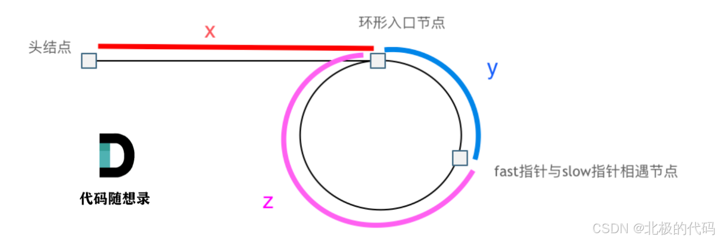 假设从头结点到环形入口节点 的节点数为x。 环形入口节点到 fast指针与slow指针相遇节点 节点数为y。 从相遇节点 再到环形入口节点节点数为 z。 如图所示: