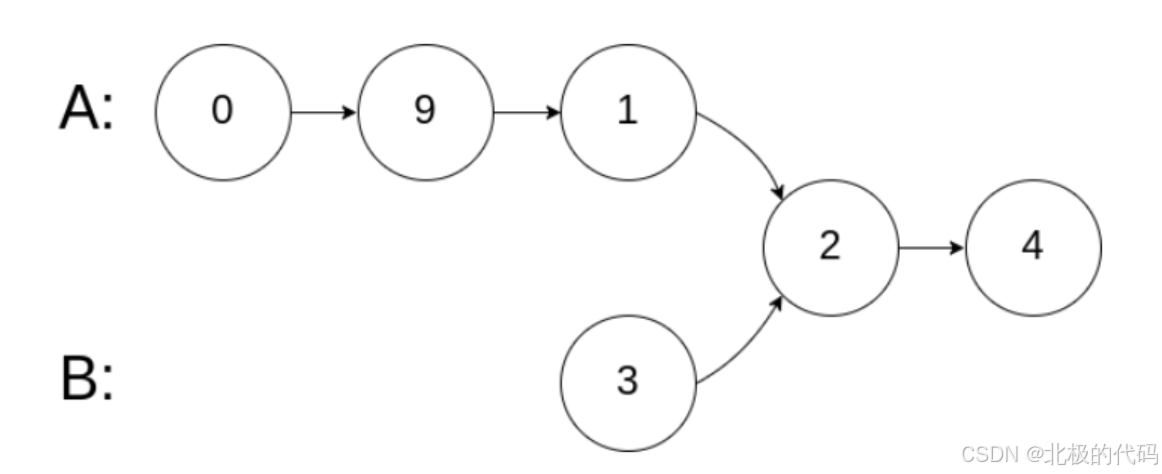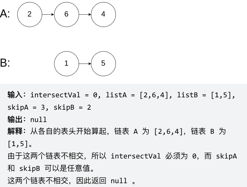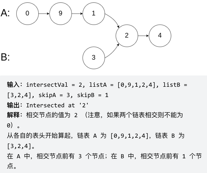 给你两个单链表的头节点 headA 和 headB ,请你找出并返回两个单链表相交的起始节点。如果两个链表没有交点,返回 null 。 图示两个链表在节点 c1 开始相交: