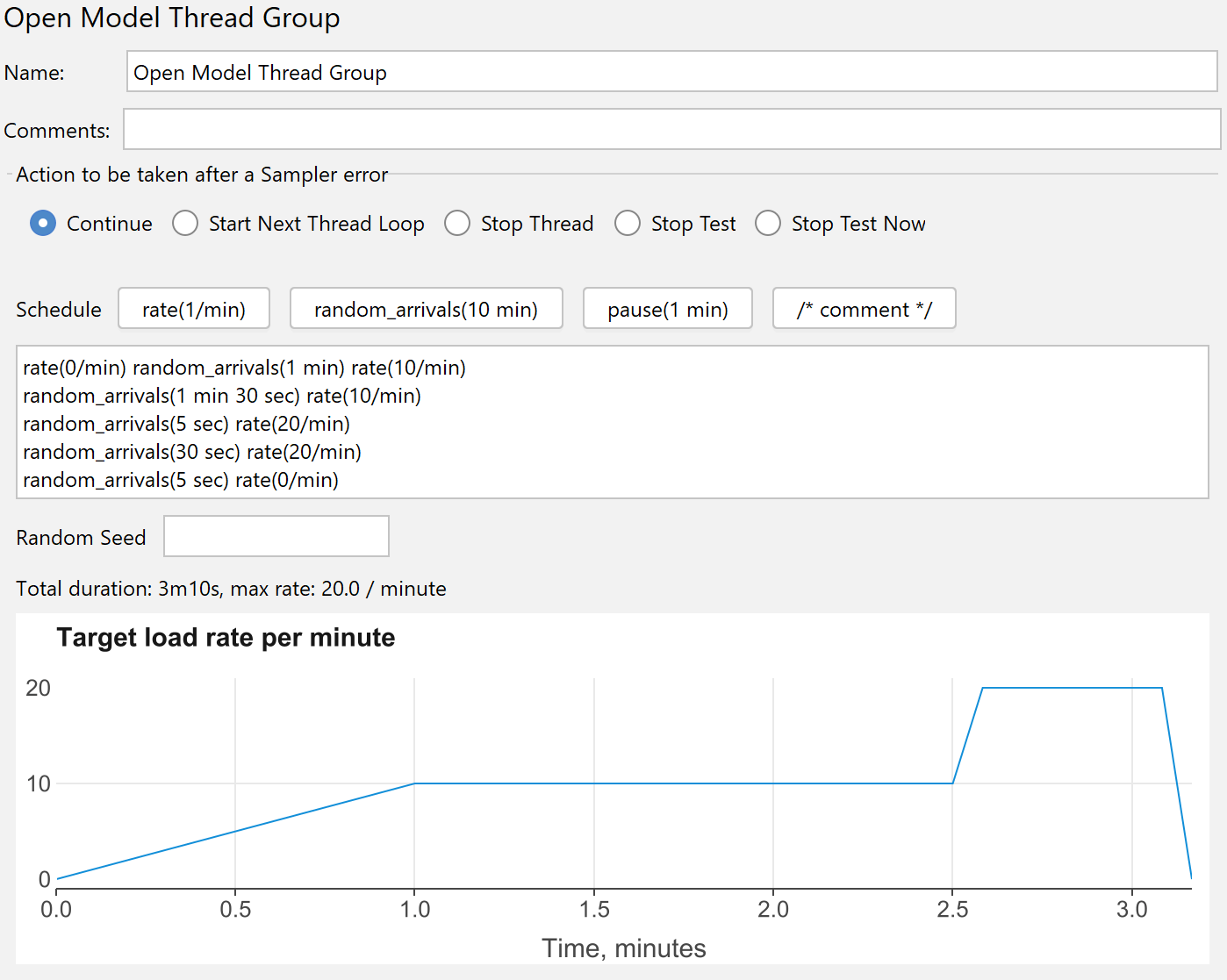 使用开放模型线程组,您可以配置与rate(0/sec) random_arrivals(1 minute) rate(10/sec) 相同的负载配置文件。线程组将根据需要生成线程来驱动配置的负载。负载配置文件可以使用属性,因此您可以启动具有略微不同负载级别的相同脚本,但是,在测试运行时无法更新配置文件。