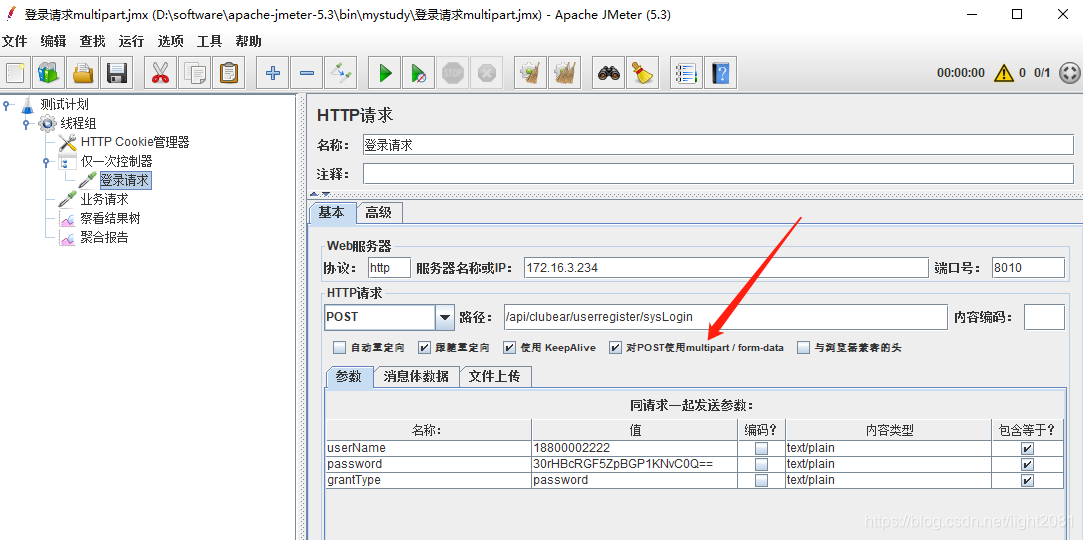 2,配置登录请求,配置表单,勾选“对POST使用multipart/form-data”,其他保持默认即可