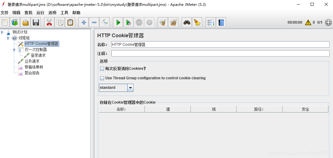 1,添加一个cookie管理器,保持默认为空即可,不需要手动添加cookie