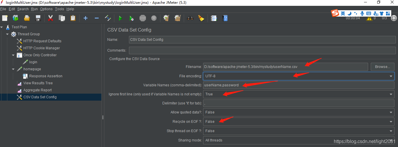 1.Filename:CSV文件名,点击Browse,选择你的CSV文件后,这里会自动生成绝对路径; 2.File encoding:CSV文件的编码格式。习惯了用 UTF-8。 3.Variable Names:变量名,后续引用变量时就用到这里的变量名,多个变量的话,用逗号分隔。比如我的例子中,CSV文件有两列,变量名这里就填写了:userName,password 4.ignore first line:忽略首行。一般来说,像我的例子中,CSV的首行是列名,这里就选择true。如果首行没有列表,直接就是数据,那么这里用false; 5.Delimiter:CSV文件分隔符。默认为",",保持默认就好,一般来说大家的CSV都是逗号分隔的。 6.Allow quoted data?:是否允许引用数据。默认设置为 false。 7.Recycle on EOF?:是否循环读取参数文件内容。默认设置为 true。像我的例子中,我只构造了3个账号,每个账号又不允许多用户在线,这里我就配置了false; 8.Sotp thread on EOF?:当读取到参数文件末尾时,是否停止读取线程,默认为 false。当 Recycle on EOF? 设置为 true 时,此项不起任何作用。当且仅当 Recycle on EOF? 为 false 时,此项配置才生效。 若为 true,则在读取到参数文件行末尾时,终止参数文件读取线程。 若为 false,此时线程会继续读取,但是会请求错误,因此时读取的数据为 EOF。 9.Sharing mode:共享模式,即参数文件变量作用域。主要有以下几种方式: (1)All threads:当前测试计划中的所有线程组中的所有的线程均有效。默认。 (2)Current thread group:当前的线程组中的线程有效。 (3)Current thread:当前线程有效。