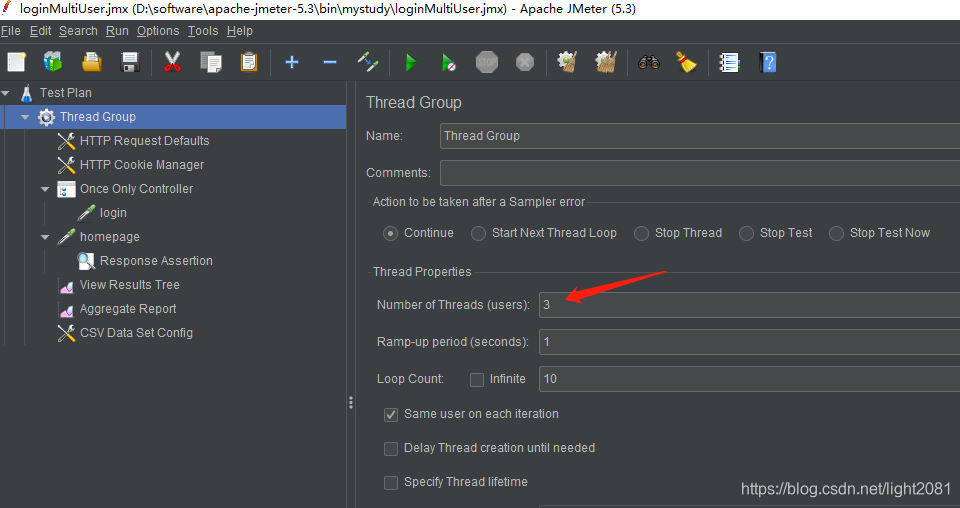我例子中构造了3个账号,所以,配置Number of Threads为3
