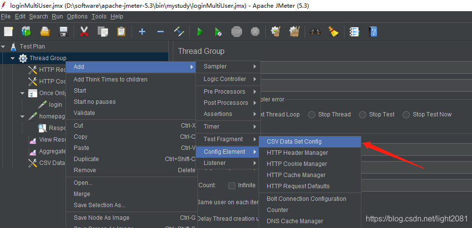 步骤1,在Thread Group下增加一个CSV Data Set Config