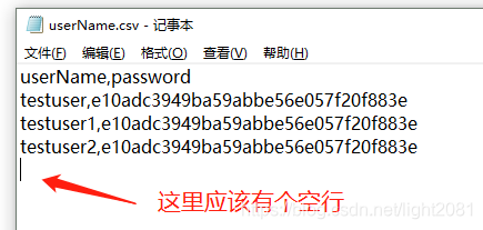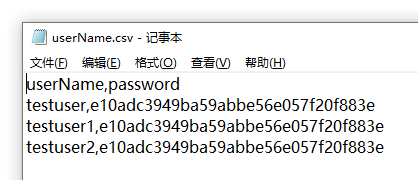 我们还是结合使用场景来说,我在系统中构造了3个测试账号,然后把这三个账号保存在一个csv文件中。
