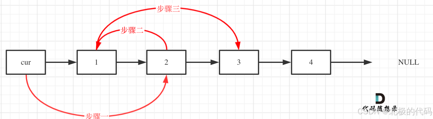 如图所示:我们把虚拟头节点设为cur,然后分别用临时节点保存需要移动的节点,我们这里保存的是第一个和第二个节点,关于temp记录的cur.next.next.next,实际上是为了步骤三交换位置。记录完之后,我们就可以开始交换了