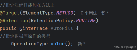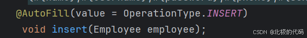 @Aspect @Component @Slf4j public class AutoFillAspect { /** * 切入点 */ @Pointcut("execution(* com.sky.mapper.*.*(..))&& @annotation(com.sky.annotation.AutoFill)") public void autoFilePointCut(){} /** * 设置通知 */ @Before("autoFilePointCut()") public void autoFill(JoinPoint joinPoint){ log.info("开始进行公共字段填充"); } }//获取当前被拦截方法的数据库操作类型