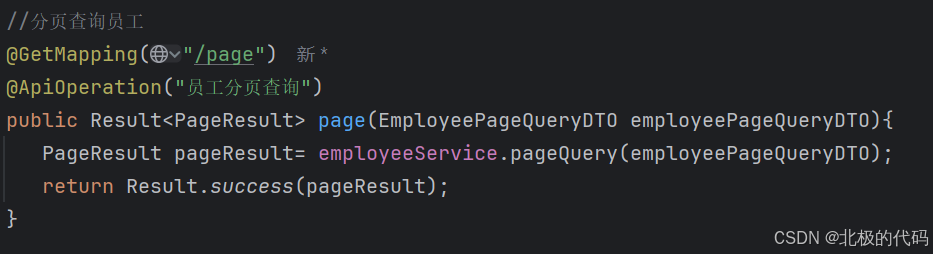 EmployeePageQueryDTO这个类中封装了前端发送数据的属性,然后调用Service层的方法进行业务查询,并把前端发过来的数据封装起来传入到Service层,这里我们调用的Result.success,并把pageResult传给了他,是为了把pageResult装进data字段,以便给前端返回数据。result对象