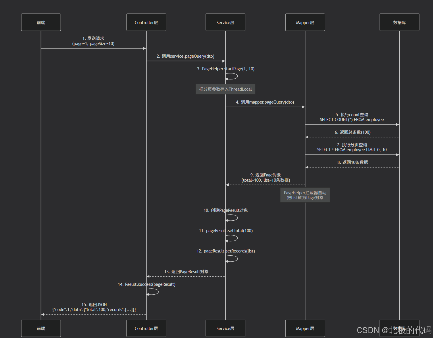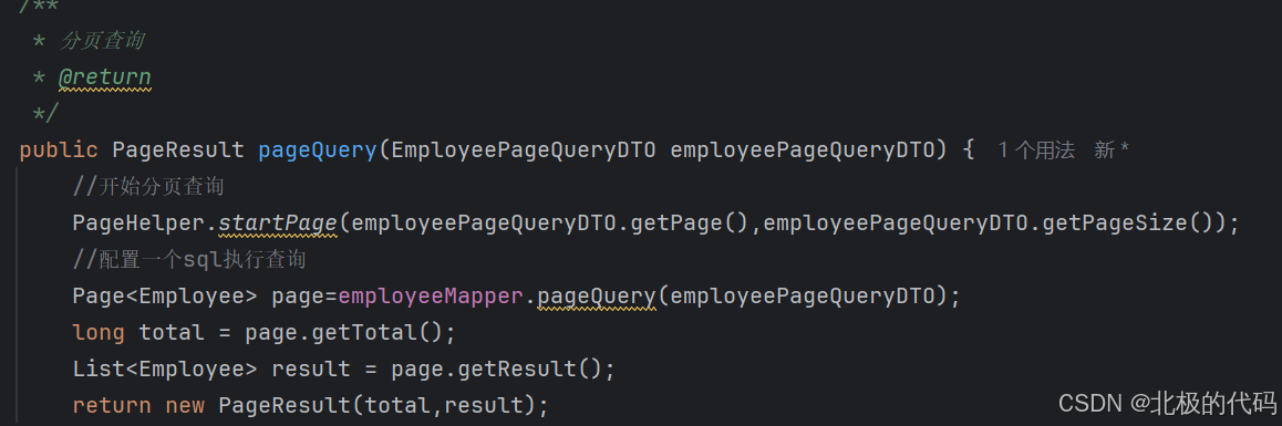 PageHelper.startPage(employeePageQueryDTO.getPage(),employeePageQueryDTO.getPageSize());这是插件的入口,在这里实现了把页码和每页条数存到 ThreadLocal 中。之后调用Mapper中的方法去数据库里根据条件进行查询,从查询到的字段中选择一些进行返回,如total,records,返回封装好的pageResult。