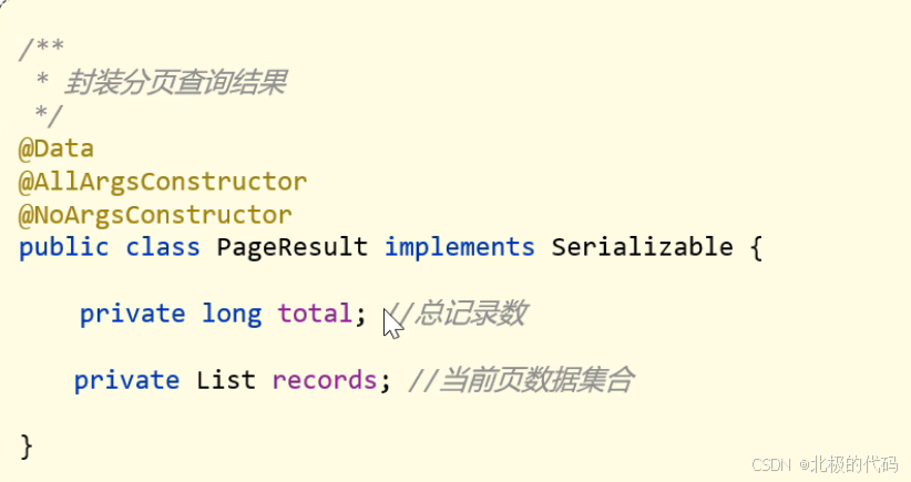 PageResult 是苍穹外卖中封装分页查询结果的一个通用类,里面的泛型 <T> 是为了让这个类能适用于任何类型的实体。