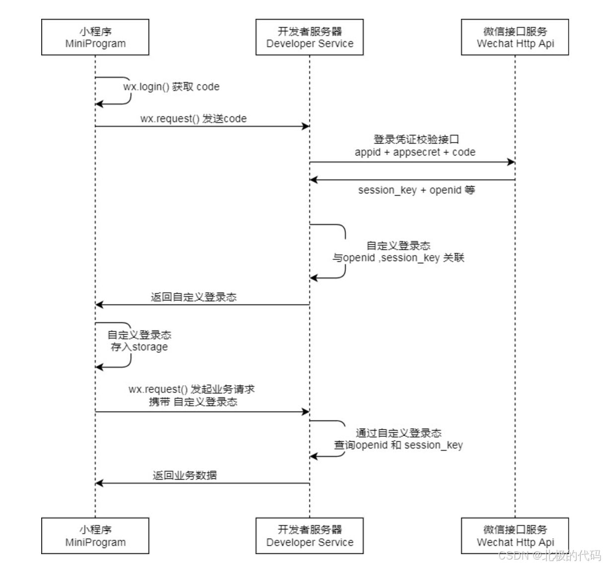 3 | 小程序把这个 code 发给自己家的后端 | — | 后端拿着 code 去问微信:"这个 code 对应谁?" |