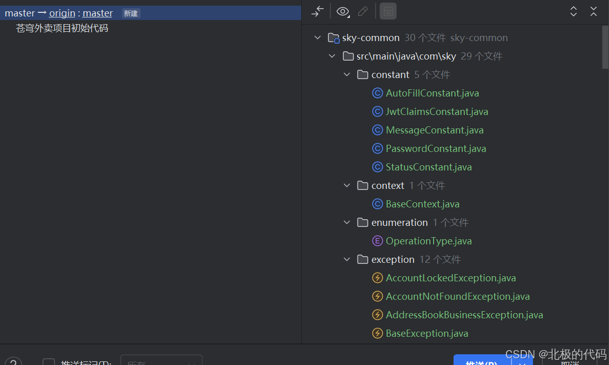 点击提交,勾选全部(已经在前面gitignore排除的已经不在列表中了),这时还没有构架远程仓库,所以不用推送。