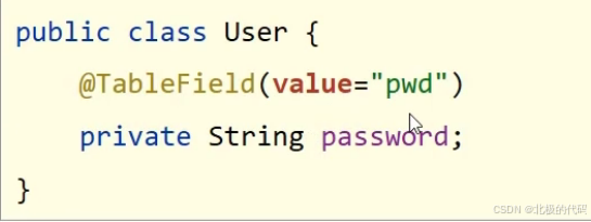 使用@TableField(value=“”)注解,写在模型类属性上方。value设置数据库表字段的名称。