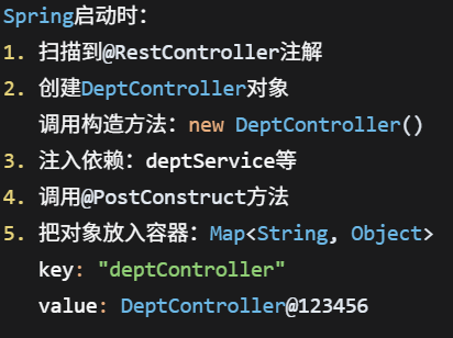 注意事项 上述所说的[Spring项目启动时,会把其中的bean都创建好】还会受到作用域及延迟初始化影响,这里主要针对于默认的单例非延迟加载的bean而言。