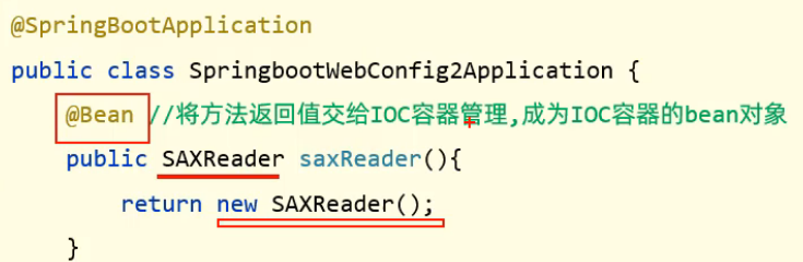 SpringBoot只能扫描启动类所在包及其子包,当我们引入第三方bean时,并不在启动类所在包或子包。这时,我们