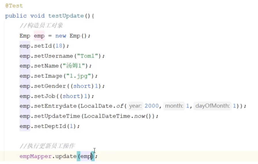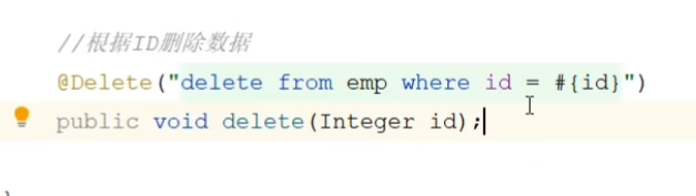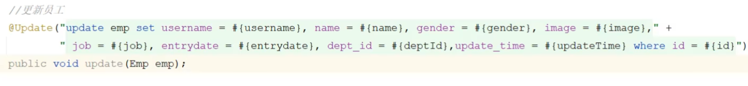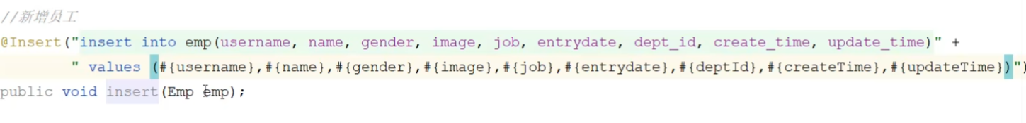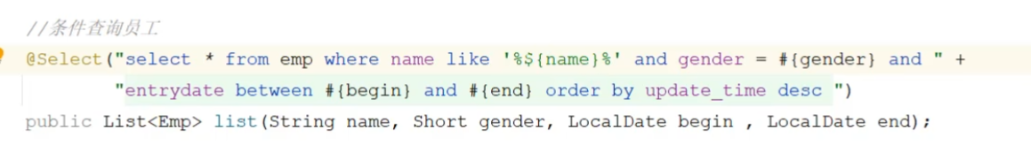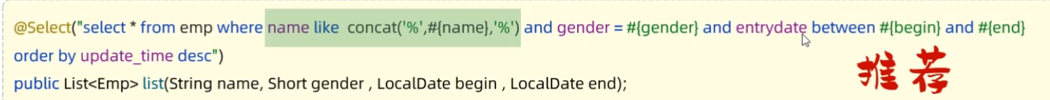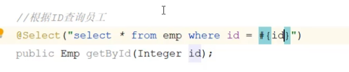 使用到了mybatis中的参数占位符#{}; 执行SQL时,会将#{}替换为?,生成预编译SQL,会自 动设置参数值。 使用时机:参数传递,都使用#{}
