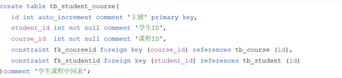 案例:学生与课程的关系 关系:一个学生可以选修多门课程,一门课程也可以供多个学生选择实现:建立第三张中间表,中间表至少包含两个外键,分别关联两方主键