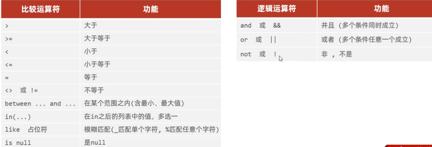 语法 条件查询:select 字段列表from 表名 where 条件列表;