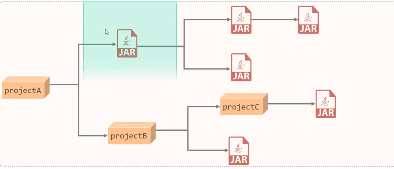 依赖具有传递性 直接依赖:在当前项目中通过依赖配置建立的依赖关系 间接依赖:被依赖的资源如果依赖其他资源,当前项目间接依赖其他资源