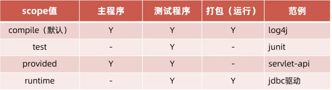 依赖的jar包,默认情况下,可以在任何地方使用。可以通过<scope>...</scope>设置其作用范围。作用范围: 主程序范围有效。(main文件夹范围内) 测试程序范围有效。(test文件夹范围内) 是否参与打包运行。(package指令范围内)