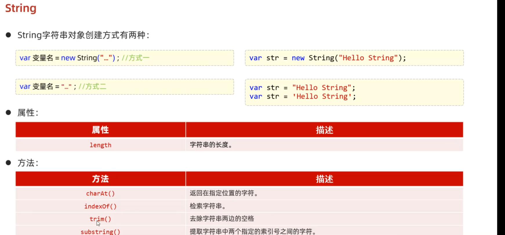var 变量名=[元素列表];//方式二 var arr =[1,2,3,4]; 访问 arr[索引l]=值; arr[10] = "hello"; 并且数组长度,类型都可变 属性 length设置或返回数组中元素的数量。 forEach()遍历数组中的每个有值的元素,并调用一次传入的函数,只遍历有值的函数 push()将新元素添加到数组的末尾,并返回新的长度 splice()从数组中删除元素。
