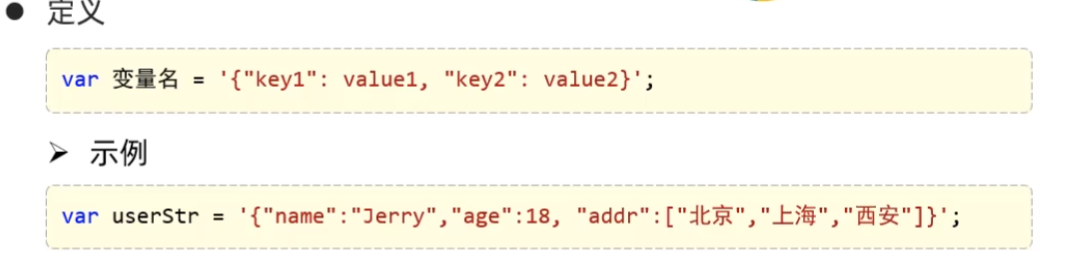value的数据类型为: 数字(整数或浮点数)字符串(在双引号中)逻辑值(true或false)数组(在方括号中)对象(在花括号中)null