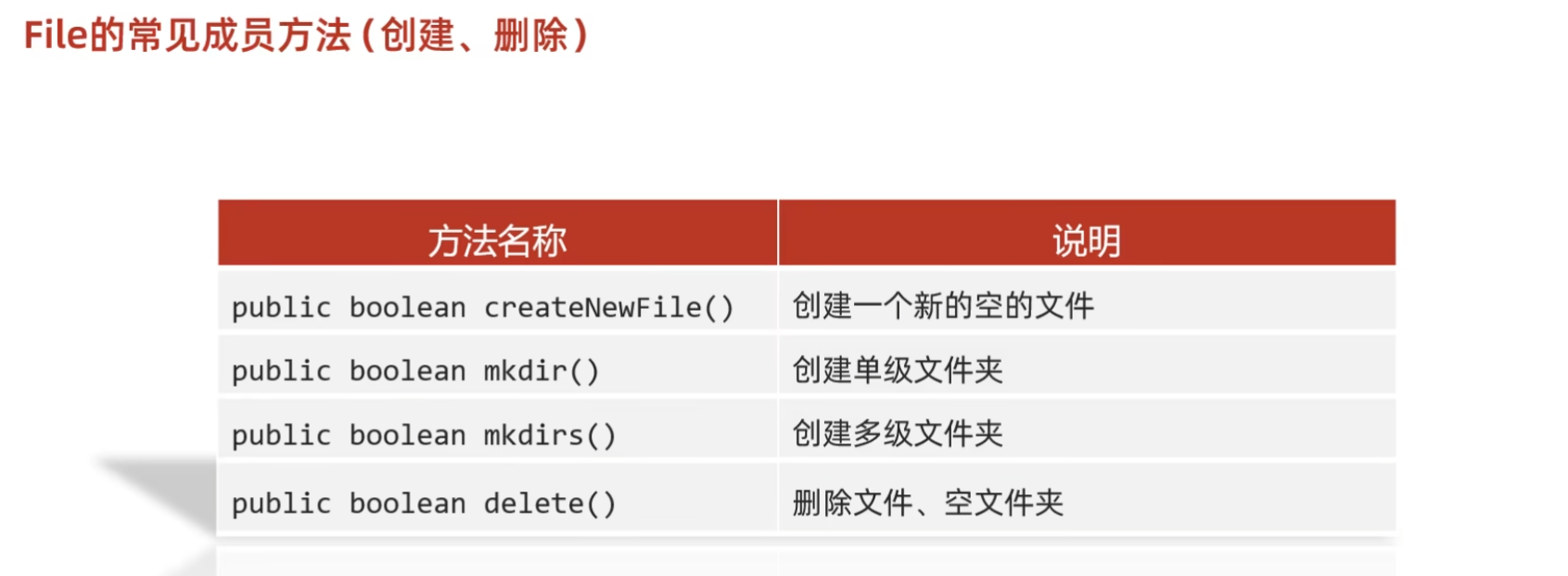 创建一个空的文件 如果当前路径不存在,则创建成功,方法返回true,反之 如果父级路径是不存在的,那么方法会有异常TOException 创建的一定是文件,如果路径不包含后缀名,则创建一个没有后缀的文件