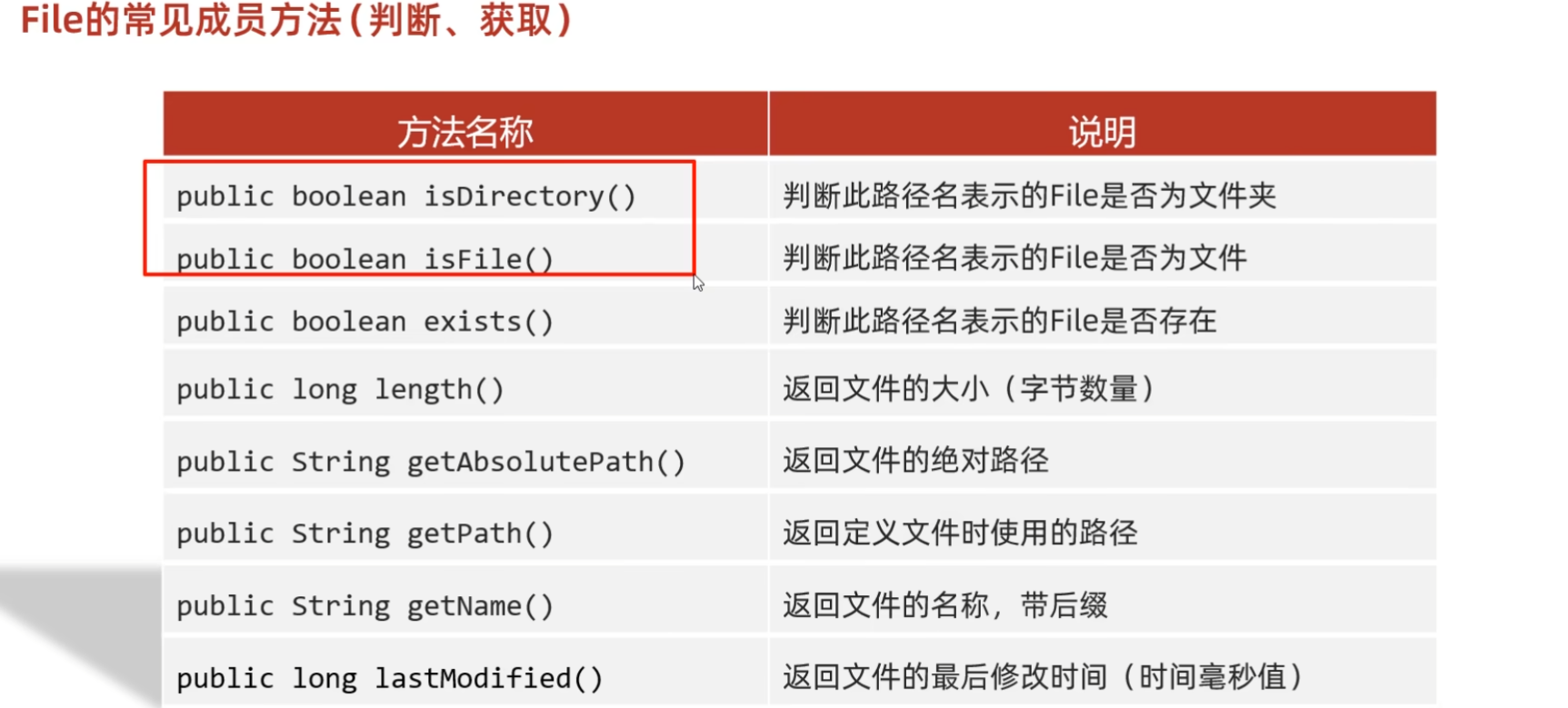 返回文件的大小(字节数量) 这个方法只能获取文件的大小,单位是字节 如果单位我们想要的是M,G可以不断地除以1024 这个方法无法获取文件夹的大小 如果我们要获取文件夹的大小,需要把这个文件夹的所有文件大小都累加在一起