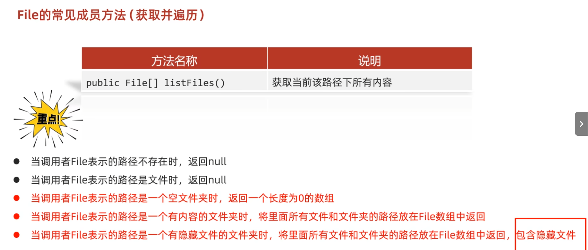 public File[] listFiles() 获取当前该路径下所有内容 重点 当调用者File表示的路径不存在时,返回null 当调用者File表示的路径是文件时,返回null · 当调用者File表示的路径是一个空文件夹时,返回一个长度为0的数组 当调用者File表示的路径是一个有内容的文件夹时,将里面所有文件和文件夹的路径放在File数组中返回 当调用者File表示的路径是一个有隐藏文件的文件夹时,将里面所有文件和文件夹的路径放在File数组中返回 包含隐藏文件