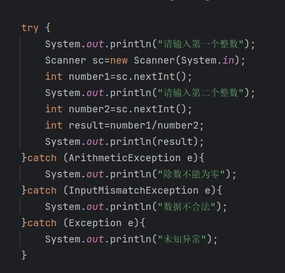 注意:catch可以同时写多个 当不确定有没有其他异常时,通常都会在后面加一个catch块,来捕获Exception(是所有异常类的父类)