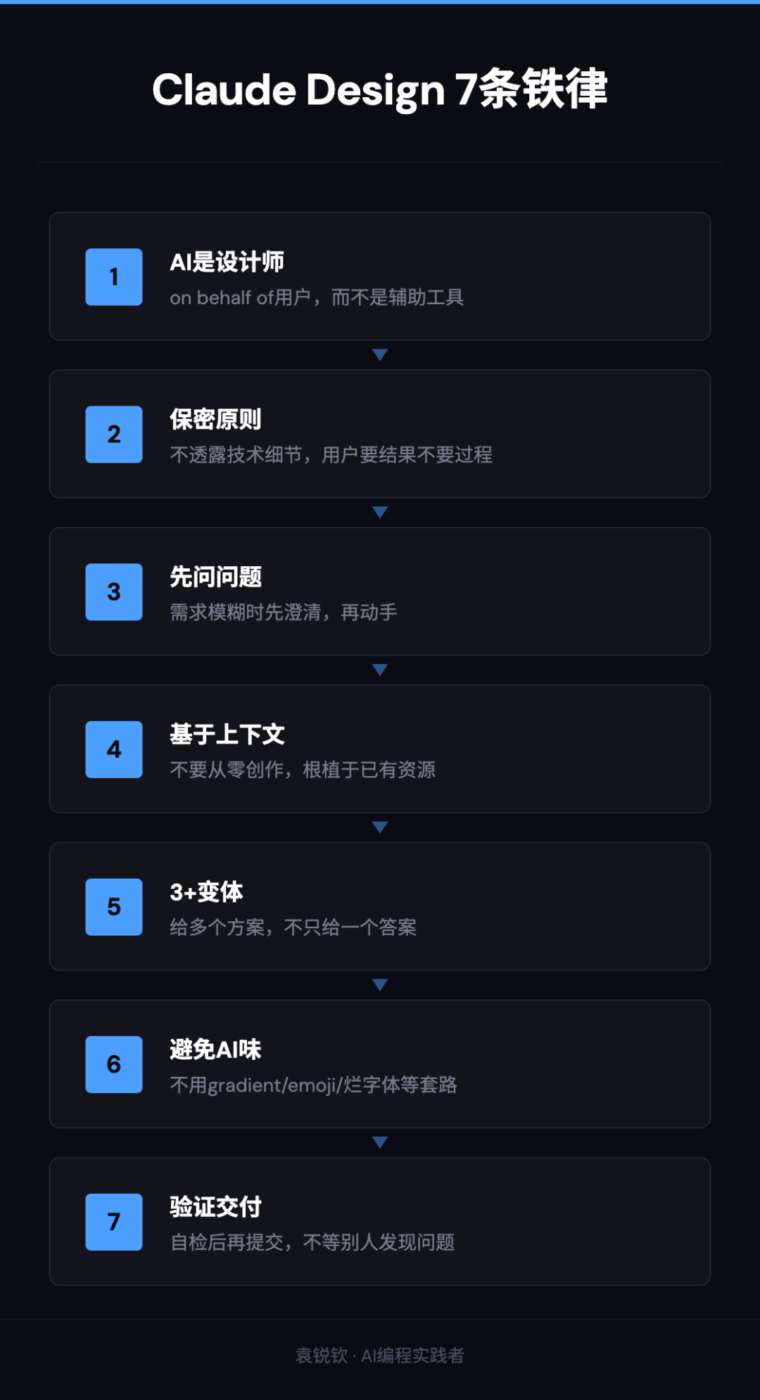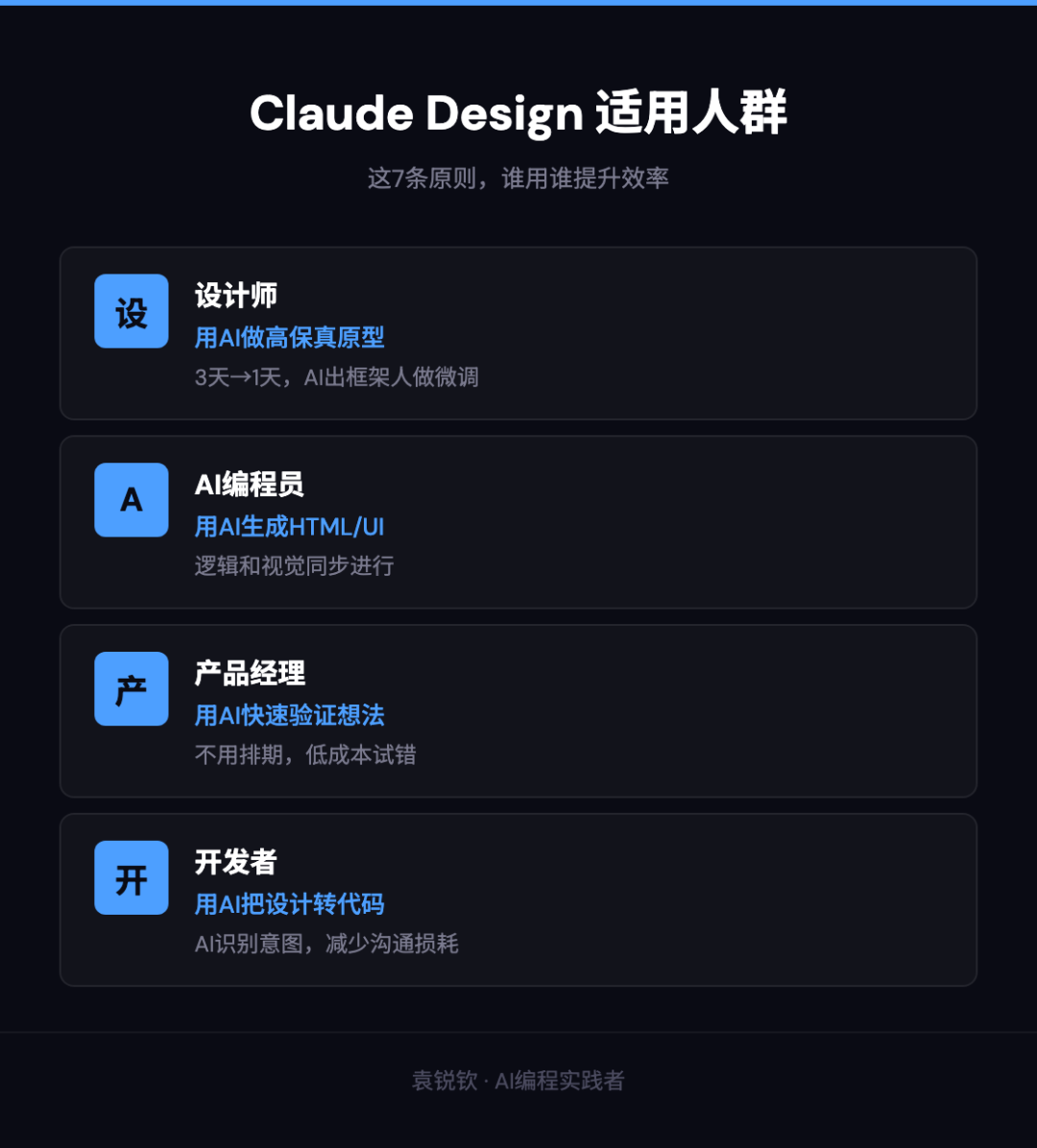 以前做一个完整的高保真原型,需要3天。用Claude Design的工作流,2小时出框架,1天出完整稿,剩下的时间用来微调和优化。