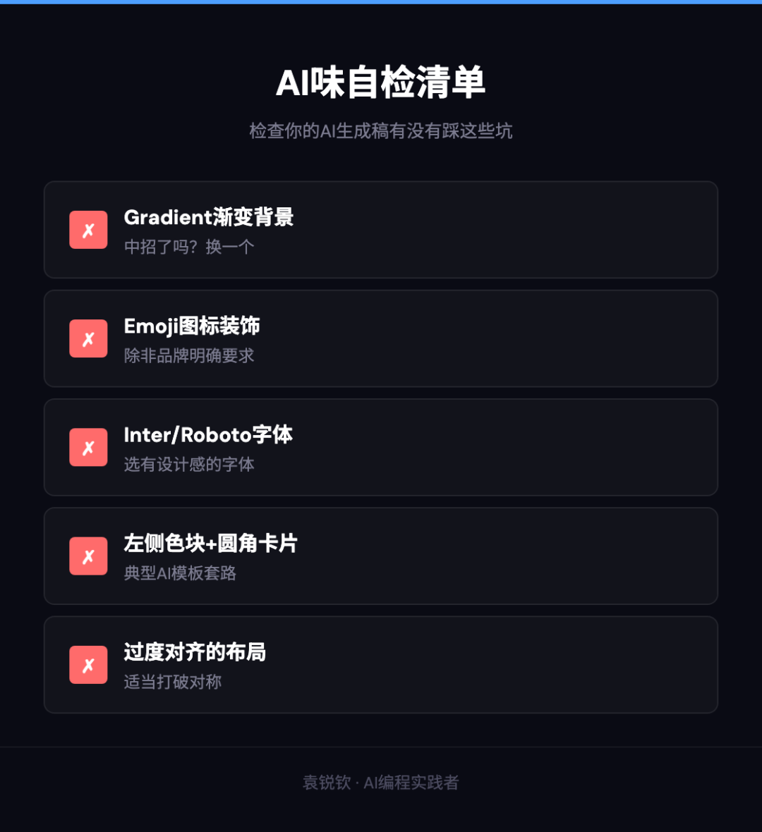 翻译过来就是:不要用那些一眼就能看出来是AI生成的设计套路。