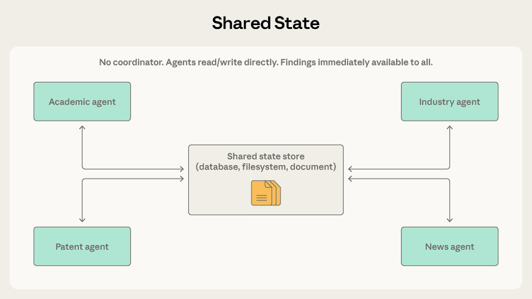 无中心协调,智能体直接读写共享存储(知识库/文档/数据库),基于共同信息自主协同。