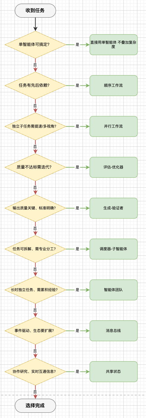 总结了每种模式的原理、适用场景、优缺点与选型方法,帮助团队在生产中精准匹配架构与业务需求,避免 latency、token 成本与可靠性的不必要损耗。