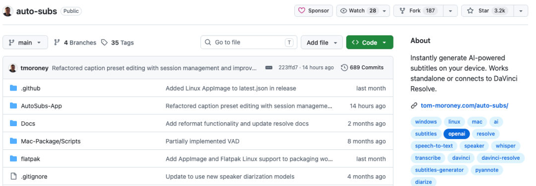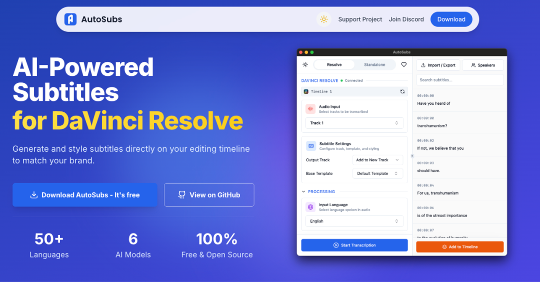 AutoSubs 是由开发者 Tom Moroney 打造的开源字幕工具,专门为视频创作者设计。