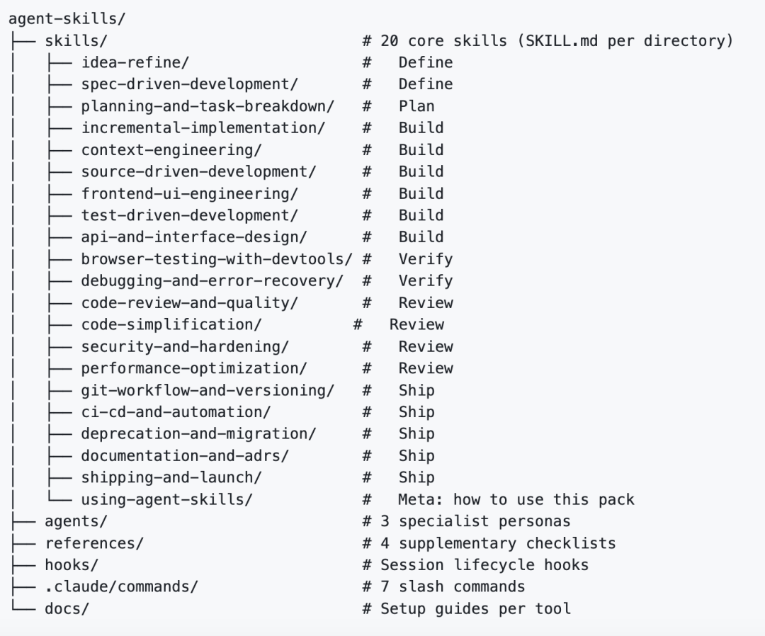 整个项目围绕软件开发生命周期的六个核心阶段设计:定义(Define)、规划(Plan)、构建(Build)、验证(Verify)、评审(Review)、发布(Ship),共计 20 个核心技能。每个技能都不是空泛的理论,而是带有具体步骤、检查点和验证标准的工作流。