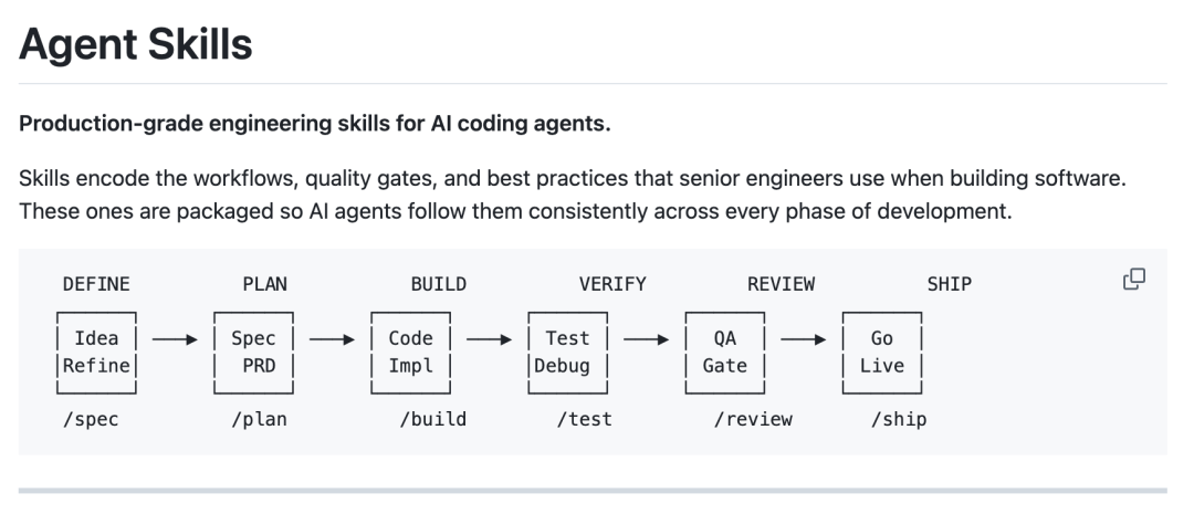 它的核心思想很简单:把资深工程师在实际工作中使用的工作流、质量门禁和最佳实践,封装成结构化的技能,让 AI 在每个开发阶段都能遵循一致的高标准。