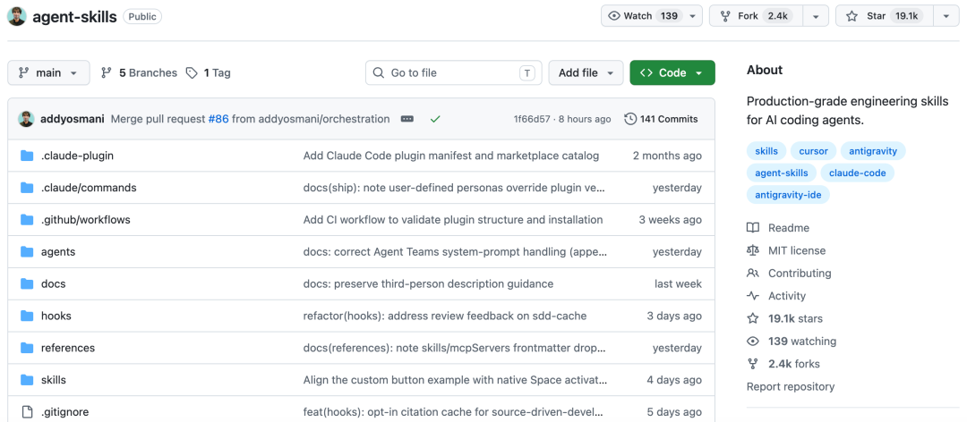 这个项目就是来自谷歌 Gemini 团队主管 Addy Osmani 的 Agent Skills。