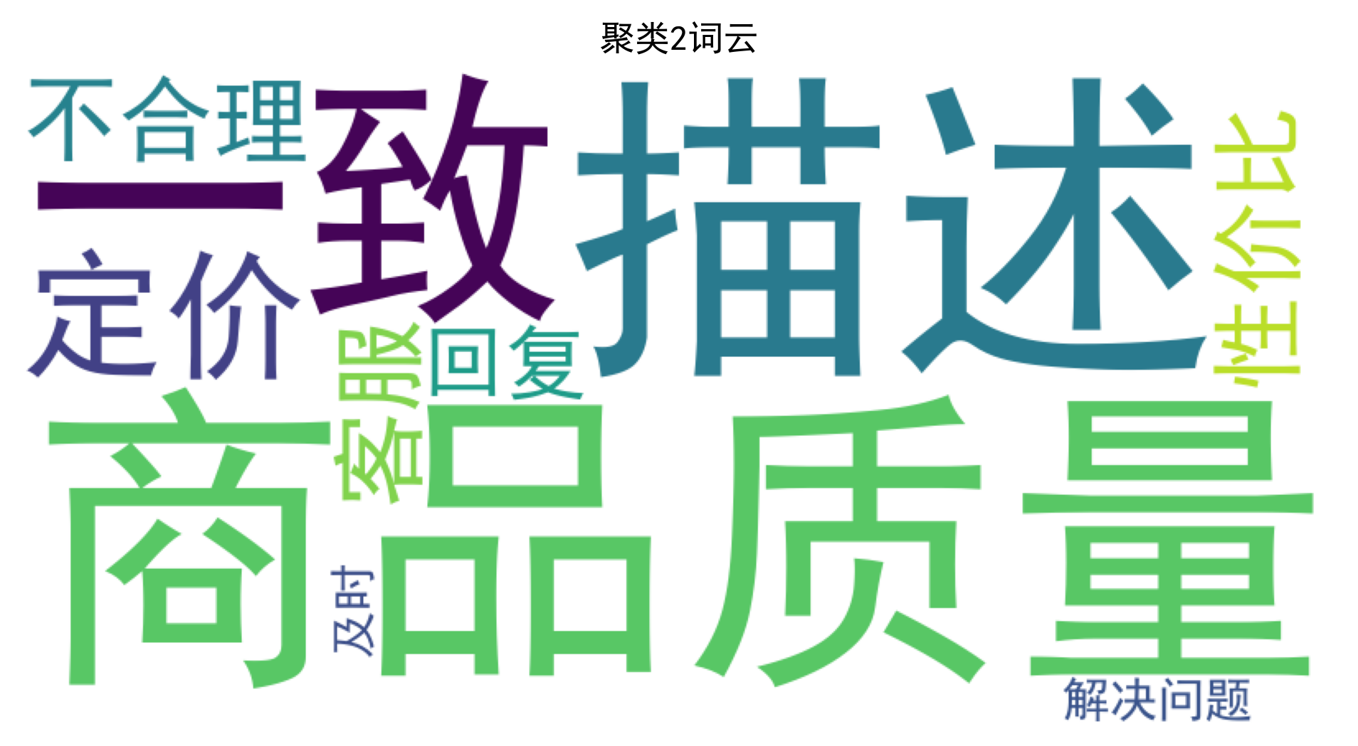 === 聚类2 === 标签:商品质量与客服 解释:此聚类聚焦于商品质量的满意度及对客服服务的评价。其中,“商品质量很好,和描述的一致”表明消费者对购买的商品质量感到满意;“客服回复慢,解决问题不及时”则揭示了消费者在服务方面的不满。 示例评论:['商品质量很好,和描述的一致', '定价不合理,性价比低', '客服回复慢,解决问题不及时']